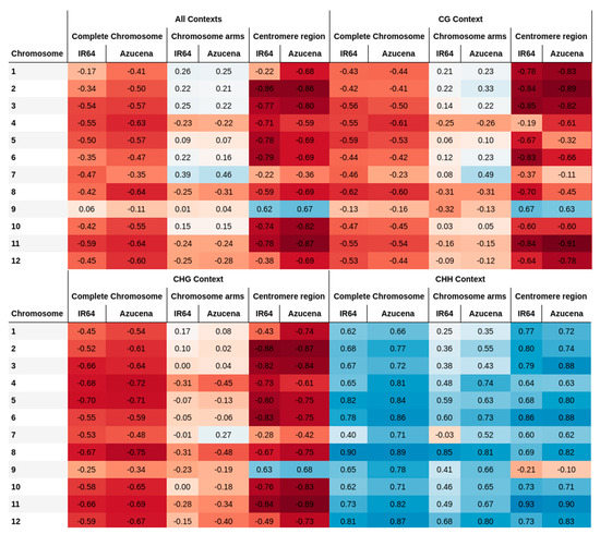 Correlations between recombination rates and the count of methylated cytosines for rice varieties IR64 and Azucena. Blue and red colors correspond to positive and negative correlations, respectively. The higher the correlation value, the higher the color intensity.