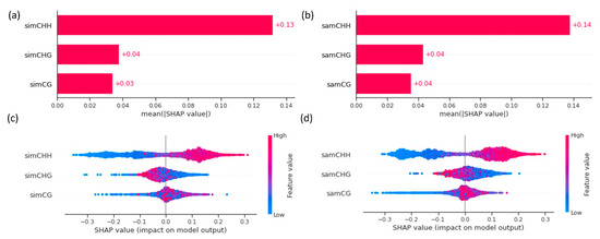 Shap values and contributions of features CG, CHG, and CHH to the prediction of recombination rates, using IR64 and Azucena data: (a) Shap summary plot of features for the IR64 variety; (b) Shap summary plot of features for the Azucena variety; (c) Shap values for the IR64 variety; and (d) Shap values for the Azucena variety.