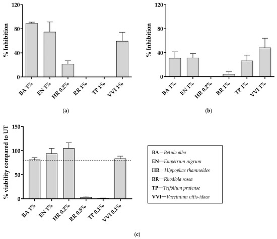 Screening results for the six extracts in (a) KLK5 inhibition assay (n = 2); (b) hyaluronidase inhibition assay (n = 2); and (c) viability assay (n = 3), where the dotted line represents 80% viability, which was the qualified test requirement for cytotoxicity. Values are displayed as mean (±SD).