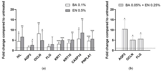 Gene expression analysis of skin barrier genes. Human primary keratinocytes were treated for 24 h with (a) single extracts: BA 0.1% (white) or EN 0.5% (grey) and (b) combination of extracts: BA 0.05% + EN 0.25% (striped). Relative gene expression was determined using the 2−ΔΔCt method. Results are presented as fold change compared to untreated where (a) n = 5 and (b) n = 3 number of donors. Statistics was calculated on ΔCt values with (a) repeated measures ANOVA and post-test Tukey or (b) paired Student’s t-test where p * ≤ 0.05, p ** ≤ 0.01 and p *** ≤ 0.001. Fold change for untreated was set to 1. Values are displayed as mean (±SD).