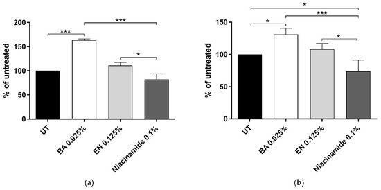 Protein expression of (a) AQP3 and (b) OCLN in human primary keratinocytes after 48 h treatment with BA or EN. As a reference, 0.1% niacinamide was used. Statistics was performed on normalized relative fluorescence intensity with repeated measures ANOVA and post-test Tukey where p * ≤ 0.05, and p *** ≤ 0.001. Untreated was set to 100% and n = 3 where n is the number of donors. Values are displayed as mean (±SD).