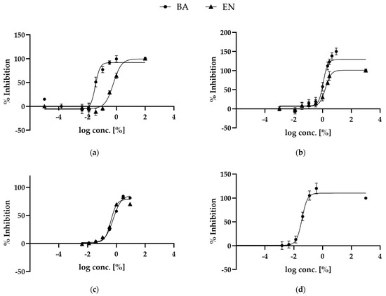 Summary of IC50 of the two extracts BA (circle) and EN (triangle) in (a) KLK5 (n = 3), (b) hyaluronidase (n = 3), (c) DPPH (n = 3) and (d) COX2 (n = 4) inhibition assays. Plotted values are displayed as mean (±SD).