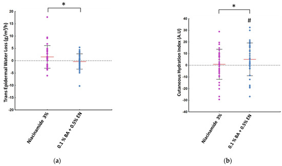 Trans-epidermal water loss (a) and cutaneous hydration index (b) after 28 days of treatment for the niacinamide (purple) and the BA + EN (dark blue) treated sides. * denotes a significant difference between the two treated sides, while # denotes a significant variation versus baseline measurements (paired Student’s t-test, p * ≤ 0.05). Red bars represent mean ± SD in black (n = 36).