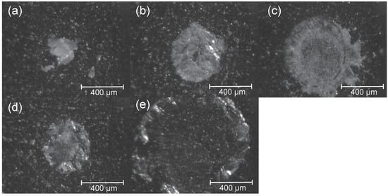 Snapshots of the morphological differences in each matrix system (0.25 μL/spot) with SGP-10 (5 pmol in 0.5 μL/spot) spotted on the AnchorChipTM MALDI target plate: (a) BOA/DHB/Na (dried overnight at room temperature), (b) BOA HCl/DHB/Na (dried overnight at room temperature), (c) aniline/DHB/Na (dried overnight at room temperature), (d) NMA/DHB/Na (dried overnight at room temperature), and (e) DHB (0.1% TFA) (dried with a hairdryer).