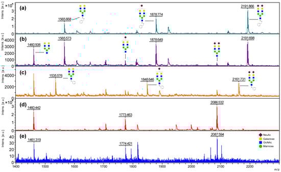 - Harveys, D.J.; Kuster, B.K.; Naven, T.J.P. Perspectives in the Glycosciences-Matrix-Assisted Laser Desorption/Ionization (MALDI) Mass Spectrometry of Carbohydrates. Glycoconj. J. 1998, 15, 333–338. [Google Scholar] [CrossRef]