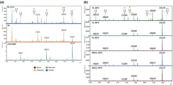 Although the ionic liquid intermediate of the BOA–DHB salt provided a reaction field for BOA-tagging of sugar chains and was advantageous for forming a homogeneous amorphous solid, the solidification time tended to be prolonged by the film of this intermediate during the blow-drying process of the mixture with an analyte []. Therefore, we optimized the oxime formation and solidification time with analytes using the BOA/DHB/Na matrix. First, the SGP-10 and BOA/DHB/Na matrix mixture was allowed to stand at room temperature. MALDI–TOFMS was performed after 1 h, 3 h, and overnight, showing that overnight was optimal (Figure 4a). To shorten the processing time, target plates with mixed droplets of SGP-10 and the BOA/DHB/Na matrix were placed in a thermostatic chamber for 1 h at 40 °C, 50 °C, and 60 °C, followed by MALDI–TOFMS, indicating that the 50 °C and 60 °C treatments were optimal. When the reaction time was reduced to 30 min, oxime formation was incomplete at 50 °C (Figure 4b, Figures S2 and S5). Mixed droplets of SGP-10 and the BOA/DHB/Na matrix formed an amorphous solid after standing at 50 °C for 30 min. This result indicates that the oxime formation reaction continued to proceed after solidification. When the mixture was allowed to stand at 60 °C, no clear difference was observed between 30 min and 1 h after solidification, confirming that hydrolysis of the sialic acid residues did not proceed. Comparison of the two conditions—room temperature overnight and 60 °C for 1 h—showed that the hydrolysis of sialic acid progressed more in the room temperature overnight condition. The evaporation of water due to heating promoted the oxime formation (i.e., dehydration) reaction and inhibited the hydrolysis of sialic acid. These results indicate that an incubation time of 30 min at 60 °C is required for the use of the BOA/DHB/Na matrix. For subsequent experiments, an incubation time of 1 h with a safety margin of 30 min was used.