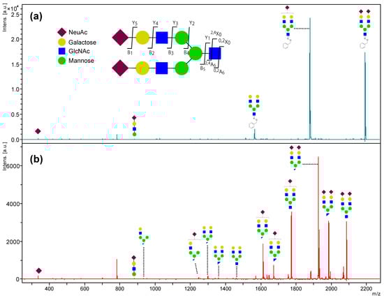 - Kurogochi, M.; Nishimura, S.I. Structural Characterization of N-Glycopeptides by Matrix-Dependent Selective Fragmentation of MALDI-TOF/TOF Tandem Mass Spectrometry. Anal. Chem. 2004, 76, 6097–6101. [Google Scholar] [CrossRef]