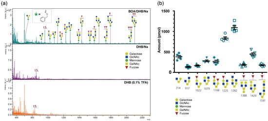 This nature of the BOA/DHB/Na matrix is suitable for profiling studies on mixtures of free glycans using MALDI–TOFMS analysis. Therefore, we carried out a proof-of-concept study using a simple scheme for O-glycan analysis via base excision [,] and Cotton hydrophilic interaction chromatography (HILIC) [] separation (Scheme 1). Mucin from porcine stomach (MPS) was treated with DBU and 50% hydroxylamine solution followed by the addition of an internal standard (IS; N,N′,N″,N‴-tetraacetylchitotetraose); the released glycan was captured on cotton wool and then eluted with water. Then, 0.5 µL of the Cotton HILIC eluate, theoretically equivalent to glycans from 100 ng of dried MPS, was mixed with each matrix, and MALDI–TOFMS measurements were performed (Figure 6a). Using the BOA/DHB/Na matrix, we identified 20 different O-linked glycans with BOA tags at the reducing end (Table S1). Using the DHB/Na and DHB (0.1% TFA) matrices, only the standard internal glycan peaks were reproducibly detected from the same amount of the sample. Next, the O-glycan profiles in five lots of the same workflow in Scheme 1 showed high reproducibility, with 10 major peaks (Figure 6b, Figures S8–S12, Table S2). The O-glycan profile of MPS detected by MALDI–TOFMS analysis using the BOA/DHB/Na matrix was consistent with the results of MALDI analysis using a multistep chemical treatment and separation process [,,].