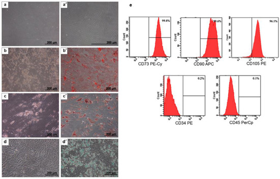 Characterization of human bone marrow mesenchymal stem cells (MSCs). The MSCs show a fibroblast-like morphology (a,a’). MSCs were cultured in ODM (b) and stained with ARS (b’). MSCs were cultured in ADM (c) and stained with Oil Red O (c’). MSCs were cultured in CDM (d) and stained with Alcian blue (d’). The phenotypic expression of CD34, CD45, CD73, CD90, and CD105 on the MSC surface were evaluated by flow cytometry (e).