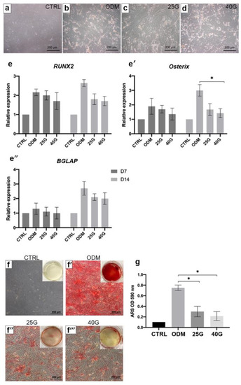 The effect of high levels of glucose on the in vitro osteogenic differentiation of MSCs. The MSCs were cultured in growth medium (control, CTRL), ODM (5.5 mM glucose), ODM with 25 mM glucose (25G), and ODM with 40 mM glucose (40G). Morphology of MSCs in each condition was observed (a–d). The expressions of RUNX2 (e), Osterix (e’), and BGLAP (e’’) were investigated at day 7 and 14. Gene expression is presented as relative to the CTRL. Alizarin Red S staining at day 14 is shown (f–f’’’). Semi-quantitative analysis of ARS staining was performed by dye extraction (g). All data are presented as the means ± SEM from three independent experiments. * p value < 0.05 is considered statistically significant.