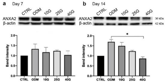 The expression of the intracellular ANXA2 was determined by a Western blot analysis after the in vitro MSC osteoblastic differentiation in the presence of 10 mM, 25 mM, and 40 mM glucose for 14 days. The expression of ANXA2 at day 7 revealed that there was no difference among the conditions (Figure 3a). At day 14, the high levels of glucose gradually decreased the expression of ANXA2 in the MSC osteoblastic differentiation in a dose-dependent manner (Figure 3b). A significant reduction in ANXA2 was observed in the 40 mM glucose condition when it was compared with that of the ODM one (5.5 mM glucose). Taken together, these data indicated the impact of high levels of glucose on the expression of ANXA2 in the MSCs during osteogenesis, which might be the cause of the deteriorated osteogenic differentiation potential of MSCs.