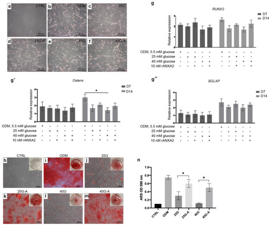 To demonstrate whether rANXA2 could recover the deteriorated osteogenic differentiation of the MSCs that were affected by the high levels of glucose, 10 nM rANXA2 was added to the high-glucose conditions, which were the 25 mM and 40 mM glucose ones. At day 14, the micrograph revealed that there were no morphological differences among the conditions (Figure 4a–f), whereas the transcriptional levels of RUNX2, Osterix, and BGLAP showed that there was a slight increase in them when rANX2 was added to the high-glucose conditions (Figure 4g–g’’). The effect of rANXA2 on the matrix mineralization of the MSCs was evaluated by an ARS staining at day 21. The treatment with rANXA2 significantly increased the ARS accumulation of the MSCs that were differentiated under high-glucose conditions (Figure 4h–n). Collectively, the deteriorated osteogenic differentiation of the MSCs under the high-glucose conditions might be governed by the alteration of the ANXA2 expression, which could be recovered by a treatment with rANXA2.