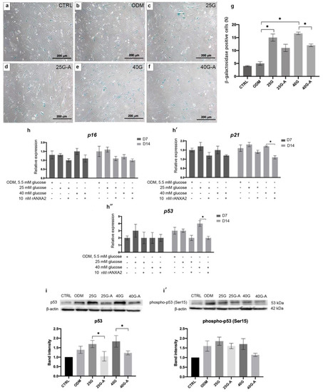 It has been demonstrated that a high-glucose concentration induces the cellular senescence of the MSCs. To examine whether ANXA2 was associated with this consequence, the senescence-associated beta-galactosidase (SA-β-gal) was examined in the MSCs during the osteoinduction under the high-glucose conditions. After 7 days of osteoinduction, the senescent cells were significantly increased in the high-glucose conditions when they were compared with that in ODM (5.5 mM glucose). The treatment with rANXA2 could significantly reduce the senescent cells in the high-glucose conditions (Figure 5a–g). The transcriptional levels of the essential senescence-associated genes were determined. There was no significant difference in the p16, p21, and p53 expression between the control ODM (5.5 mM glucose) and the high-glucose ODM (25 mM and 40 mM glucose). However, the addition of rANXA2 to the high-glucose conditions downregulated the expression of p16, p21, and p53. The marked reduction in the genes was observed at day 14 in the 40 mM glucose condition (Figure 5h–h’’). A Western blot analysis revealed that there was a significant reduction in p53 in the presence of rANXA2 in the ODM with the high-glucose conditions in both the 25 mM and 40 mM glucose tests (Figure 5i). The expression of phosphorylated p53 (Ser15), which is the active form, was also reduced by the rANXA2 treatment, however, it was not significantly different when it was compared with that in the high-glucose conditions (Figure 5i’). Taken together, these results suggest that rANXA2 may improve in vitro osteogenic differentiation of the MSCs under the high-glucose conditions by reducing the cellular senescence.