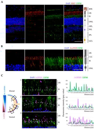 Briefly, eyes from adult mice were enucleated, fixed in 4% paraformaldehyde (PFA), and embedded in OCT []. Twelve μm retinal sections were recovered on commercial Superfrost Plus glass slides (Electron Microscopy Sciences, Hatfield, PA) and kept frozen at −80 °C until use. Cryosections were rehydrated with phosphate-buffered saline (PBS) and permeabilised in 0.5% Triton X-100 (Sigma-Aldrich, St. Louis, MO, USA) in PBS for 20 min. Sections were then subjected to antigen retrieval using 0.05 mg/mL Proteinase K (Sigma-Aldrich, St. Louis, MO, USA; P2308) in PBS for 2 min and blocked in 5% sheep serum (Merck, Darmstadt, Germany; S22) in PBS for 1 h. Incubations with the primary antibodies anti-USP48 (Abcam, Plc, Cambridge, UK; ab72226; 1:50), anti-RHODOPSIN (Abcam, Plc, Cambridge, UK; ab5417; 1:250), anti-acetylated α-TUBULIN (Sigma-Aldrich, St. Louis, MO, USA; T6793; 1:1000) and anti-S-OPSIN (Thermo Fisher Scientific, Rockford, IL, USA; 600-101-MP7; 1:50) were performed overnight at 4 °C. After three washes with PBS, cryosections were incubated in a blocking solution for 1 h at room temperature with the corresponding secondary antibodies: AlexaFluor 568 anti-Mouse (Thermo Fisher Scientific, Rockford, IL, USA; A11004; 1:400), AlexaFluor 488 anti-Rabbit (Thermo Fisher Scientific, Rockford, IL, USA; A11070; 1:400), and AlexaFluor 633 anti-Goat (Thermo Fisher Scientific, Rockford, IL, USA; A21082; 1:100), and nuclei were stained with 4′,6-diamidine-2′-phenylindole dihydrochloride (DAPI) (Sigma-Aldrich, St. Louis, MO, USA; 10236276001; 1:1000). Finally, the slides were rinsed with PBS and coverslipped with ProLong™ Gold Antifade Mountant (ThermoFisher Scientific, Rockford, IL, USA; P1014).