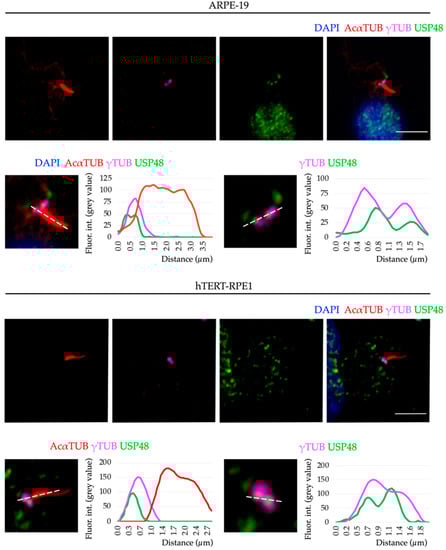 hTERT-RPE1 cells were fixed in 2% PFA for 5 min followed by 4% PFA for 30 min at room temperature. Afterward, cells were washed in PBS, permeabilised in 0.5% Triton X-100 (St. Louis, MO, USA) in PBS for 20 min at room temperature, and blocked for 1 h in either 3% bovine serum albumin (BSA) (NZYTech, Lisbon, Portugal; MB04602) or in 10% Normal Goat Serum (NGS) (Thermo Fisher Scientific, Rockford, IL, USA; 16210064) in PBS with 0.2% Triton X-100 (St. Louis, MO, USA). The following primary antibodies were incubated overnight at 4 °C in blocking solution: anti-USP48 (Abcam, Plc, Cambridge, UK; ab72226; 1:50), anti-γ-TUBULIN (Sigma-Aldrich, St. Louis, MO, USA; T6557; 1:500), anti-GFP (Abcam, Plc, Cambridge, UK; ab290; 1:500), anti-HA (BioLegend, San Diego, CA, USA; 901502; 1:250), and anti-FLAG (BioLegend, San Diego, CA, USA; 637301; 1:250). After incubation, cells were rinsed with PBS and incubated with the corresponding secondary antibodies in a blocking solution for 1 h at room temperature: AlexaFluor 568 anti-Mouse (Thermo Fisher Scientific, Rockford, IL, USA; A11004; 1:300), AlexaFluor 488 anti-Rabbit (Thermo Fisher Scientific, Rockford, IL, USA; A11070; 1:300), AlexaFluor 647 anti-Mouse (Thermo Fisher Scientific, Rockford, IL, USA; A21235; 1:300) AlexaFluor 488 anti-Rat (Thermo Fisher Scientific, Rockford, IL, USA; A11006; 1:300). Nuclei were stained with 4′,6-diamidine-2′-phenylindole dihydrochloride (DAPI) (Sigma-Aldrich, St. Louis, MO, USA; 10236276001; 1:1000). A 2-h incubation at room temperature was used for AlexaFluor 546-conjuaged acetylated α-TUBULIN (Santa Cruz Biotechnology, Dallas, TX, USA; sc-23950 AF546; 1:250). Finally, coverslips were washed with PBS and mounted using Mowiol 4-88 (Merck, Kenilworth, NJ, USA).