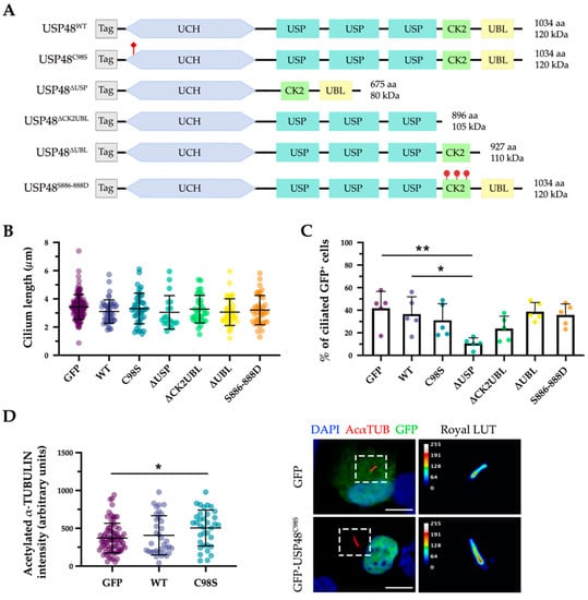 Next, to assess the role of USP48 in ciliary formation and function and to identify relevant protein domains, different USP48-derived constructs were used: the wild-type and catalytically inactive mutant (USP48C98S), plus several newly generated mutants e.g., three deletion proteins (USP48∆USP, USP48∆CK2UBL, and USP48∆UBL) and one hyper-activated USP48S886−888D (simulating the permanent phosphorylation of the three regulatory serine residues) (Figure 3A).