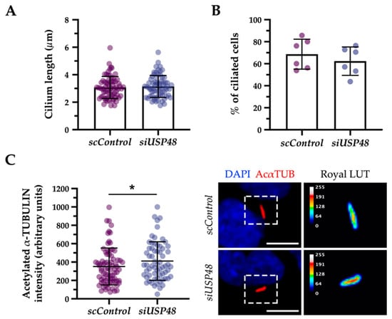 We next assayed the potential effects of silencing USP48 in ciliogenesis. The knockdown of USP48 by siRNA transfection (silencing efficiency previously tested in []), showed similar results to the overexpression experiments: neither ciliary length nor ciliogenesis was clearly affected by USP48 knockdown (Figure 4A,B), although the ciliary acetylate α-tubulin increased (Figure 4C), suggesting that the lack of functional USP48 resulted in hyper-acetylation of α-tubulin in the cilium.