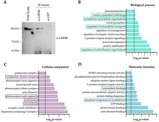 With the aim to further elucidate the role of USP48 in the retina and identify its interactors, we performed a non-denaturing co-immunoprecipitation of mouse retinas with anti-USP48 (Figure 5A). The proteomics results of the eluted proteins by mass spectrometry (Supplementary File S1) were subjected to a Gene Ontology (GO) enrichment analysis to have a functional overview of the principal pathways and cellular subcompartments associated with endogenous USP48 in the retina. As much as 25% of the USP48 interactors were involved in microtubule and actin cytoskeleton and microtubule-dependent intracellular transport, with an enrichment in the “centrosome”, “microtubule”, and “photoreceptor outer segment” terms, which are cilium-related compartments (Figure 5B–D). These protein interactors are consistent with the basal body localisation of the endogenous USP48 (Figure 2) and its high expression in cone OS (Figure 1B,C). “Photoreceptor inner segment” and “photoreceptor ribbon synapse” terms were also enriched, in accordance with USP48 signal in mouse retina cryosections (Figure 1A).