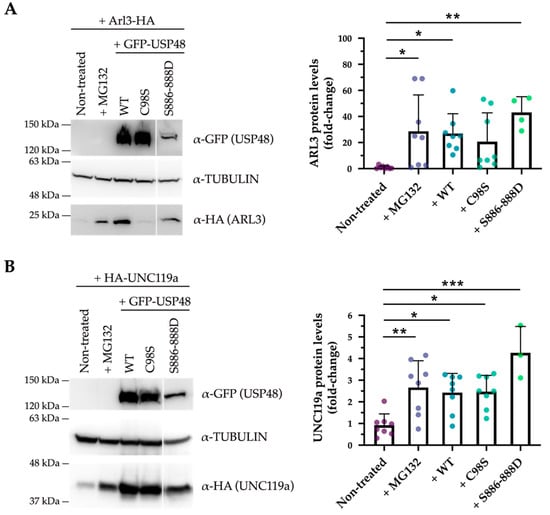 To study whether the interaction between USP48 and ARL3 and UNC119a was dependent on the USP48 DUB activity, the protein stability of these interactors was assayed in different conditions, and several USP48-derived constructs (USP48WT, catalytically inactive USP48C98S or hyperactive USP48S886−888D). First, ARL3 and UNC119a showed to be both degraded via the proteasome, as inhibiting the proteasome by adding the proteasome inhibitor MG-132 resulted in a marked increase of the two proteins. Overexpression of USP48 increased the stability of either protein to similar levels to proteasome inhibition (Figure 6). However, the rescue of protein levels was distinct for both interactors. The increase of ARL3 protein stability was dependent on the DUB activity of USP48, as the catalytically inactive USP48C98S mutant could not rescue ARL3 from proteasomal degradation and the hyperactive USP48S886−888D enzyme was significantly more efficient in stabilising ARL3 levels (Figure 6A). On the other hand, UNC119a protein levels were stabilised by all three USP48 variants, irrespective of the DUB activity, indicating that the presence/interaction with the protein was sufficient for UNC119a protein stabilisation (Figure 6B). These results were consistent and independent of the epitope tag used (Figure S4), overall suggesting that the USP48 interaction and stabilisation of ARL3 and UNC119a occur by different mechanisms.