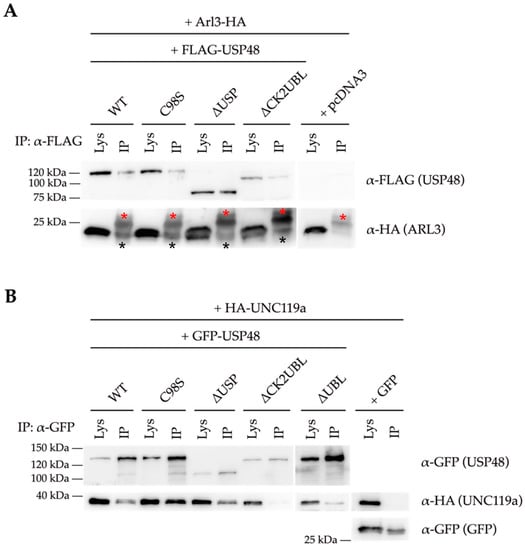 Different domains of USP48 are required for stabilisation of ARL3 and UNC119a. Co-immunoprecipitation using different GFP-USP48 deletion constructs shows that (A) the C-terminal domains of USP48 are not required for the interaction with ARL3-HA, and (B) the most C-terminal domains (the regulatory CK2 and UBL domains) are responsible for the interaction of USP48 with HA-UNC119a. Note that ARL3 (approx. 23 kDa, indicated by a black asterisk) has a similar molecular weight to the light IgG chains (red asterisk). Lys, lysate; IP, immunoprecipitate.