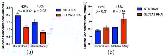 | NTS RNAi Umbilical Art. | SLC2A3 RNAi Umbilical Art. | p-Value | % Change | NTS RNAi Umbilical Vein | SLC2A3 RNAi Umbilical Vein | p-Value | % Change | |