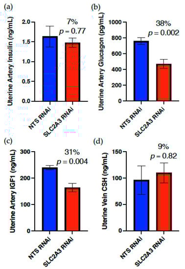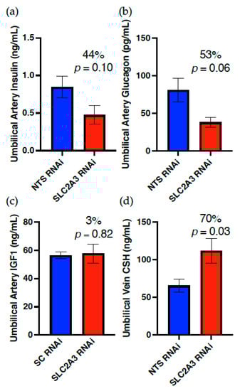 - Tanner, A.R.; Lynch, C.S.; Kennedy, V.C.; Ali, A.; Winger, Q.A.; Rozance, P.J.; Anthony, R.V. CSH RNA interference reduces global nutrient uptake and umbilical blood flow resulting in intrauterine growth restriction. Int. J. Mol. Sci. 2021, 22, 8150. [Google Scholar] [CrossRef] [PubMed]