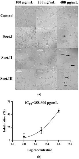 (a) Effects of ultra-filtration components in hemolymph of A. chinensis on SGC-7901 cells after 48 h treatment. Control: cell group without drug; Sect. I: molecular weights of the section < 3 kD; Sect. II: molecular weights of the section between 3 kD and 50 kD; Sect. III: molecular weights of the section > 50 Kd, the cells indicated by the arrow are morphologically altered cells. (b) IC50 curve fitting of Sect. II.