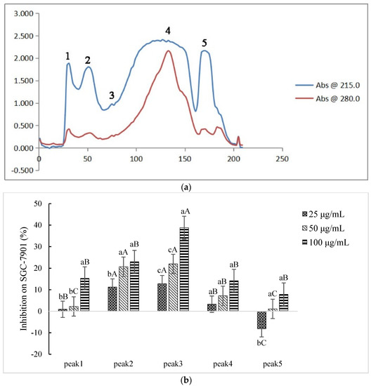 The hemolymph is more effective for inhibition of SGC-7901 cells than other tissues of A. chinensis. The protein/peptide section is more effective for inhibition of SGC-7901 cells than other constituents in the hemolymph [29]. However, the content of the protein/peptide in the hemolymph of A. chinensis is very low. Separation and purification of the peptide (antitumor active component) in this study are valid, which is indicated by the decreasing of IC50 values for sequential separating products (Table 2). The final yield rate of the peptide (compared to 3–50 kD product by ultrafiltration) is very low (0.020%). The very low yield rate of active components for each separation/purification operation is not consistent with the change of IC50 values for the respective product (Table 2). This result could be as a result of the partial recovery of active components in each operation or from losses of active components that possess minor or auxiliary active components in each separation/purification step (Figure 3a, Figure 4a and Figure 5a,b).