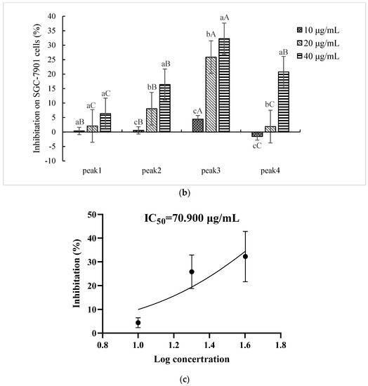 Inhibition effect of components separated by FPLC. (a) The elution curve of FPLC, linear electrical conductivity showed correctly linear elution. (b) Inhibitory rates of cell proliferation (SGC-7901 cells) induced by Sect. II-3-1-4 that were separated by FPLC after 48 h treatment. a, b, c means p < 0.05; A, B, C means p < 0.01. (c) IC50 curve fitting of Sect. II-3-3.