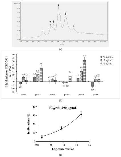 Five fractions in Sect. II (3–50 kD, ultrafiltration) were discriminated and eluted (Figure 2a): peaks 1–5 were denoted as Sect. II-1–5, respectively. Each fraction (differential peak collection) was desalted, freeze-dried, and re-dissolved to various concentrations to test the inhibition effects on SGC-7901 cells. Except for Sect. II-5 (peak 5) at lower concentration (25 μg/mL), the fractions expressed inhibitory effects (Figure 2b). Although Sect. II-3 (peak 3) and Sect. II-2 (peak 2) both expressed stronger inhibition, there was not further enhancement of the inhibition effect along with increasing dosage for Sect. II-2. Sect. II-3 had more effective inhibition on proliferation of SGC-7901 cells (with a dosage-dependent manner) than other fractions, especially at high concentrations (100 μg/mL), and the IC50 value was 155.200 μg/mL (Figure 2c). Therefore, Sect. II-3 was used for further separation or purification.