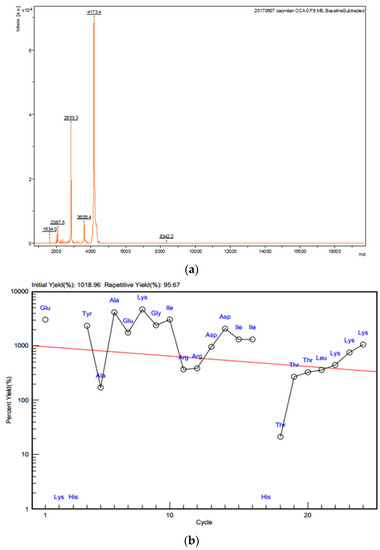 Molecular weight and amino acid sequence of active peptide. (a) Molecular weight of the active peptide determined by MALDI-TOF-MS. (b) N-terminal amino acid sequence of active protein.