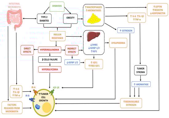 The biological mechanisms that correlate metabolic states and the onset or progression of breast cancer are multiple, complex and still not fully clarified, particularly regarding their sequence. However, what is certain is that very important and well-established hormonal, inflammatory, growth and microbial factors come into play in this relationship. Figure 1 below covers most of these factors (at least the most important and frequent) by placing them in correlation with each other and highlighting the multidisciplinary nature of the situation and the influence that the various conditions have on the final event. Figure 1 only summarizes the role played by the most frequent metabolic disorders, to which all of the mechanisms already known in the pathogenesis of breast cancers are added, such as genetically determined ones.