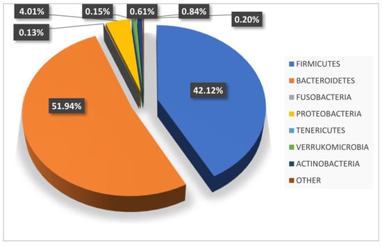 In general, as we all know, the analysis of the bacterial phyla of the gut microbiota demonstrates, in adults, the presence of two primarily dominant groups which together constitute approximately 95% of the microbial populations. These are known as the Bacteroidetes and Firmicutes. The remaining about 5% is mainly attributable to the phyla Proteobacteria, Actinobacteria, Tenericutes, Verrucomicrobia and Fusobacteria (Figure 2).