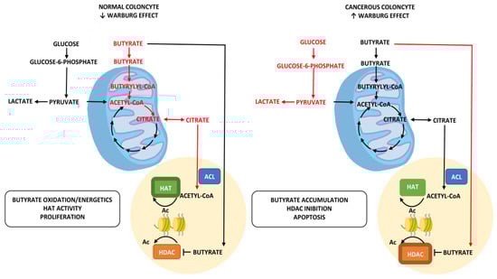 Oncosuppressive role of butyrate. Under normal conditions, butyrate is mainly used as an energy producer by cells. In those tumors, the energy is obtained in particular from glucose (Warburg effect) and the excess butyrate is sent to the nucleus where, being a natural acetylator, it contributes to a tumor antiproliferative action.