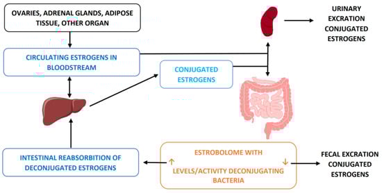 This condition can be summarized as a greater share of circulating estrogens (in addition to those possibly increased by the presence of obesity and by the greater aromatase activity) resulting from the action of the gut microbiota and is an inherent risk factor for all hormone-dependent oncological diseases such as mammary and endometrial cancer. To understand how this dangerous scenario arises, it is necessary to remember how normally circulating estrogens, once their function has been performed, are conjugated in the liver in order to be eliminated via the urinary or fecal route. Clearly, this last portion, passing through the intestine, comes into contact with the gut microbiota which, under certain conditions, can modify this process. In particular, the presence of a greater share of bacteria with b-glucoronidase activity can, through this action (determined by an enzyme they produce called b-glucuronidase), deconjugate estrogens, making them active again and reintroducing them into the circulation [] (Figure 4). This estrogenic surplus circulating is obviously a risk factor for all of the target organs (rich in estrogen receptors).