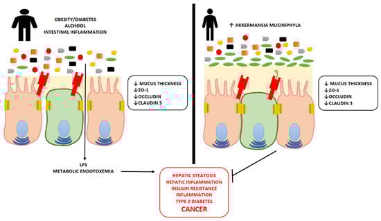 AM is responsible for the thickness of the mucus layer of the GUT. The amount of this bacterium affects body weight and metabolic disorders in the sense that the amount is inversely proportional to the presence or absence of conditions such as obesity or diabetes. In fact, when the AM is poorly expressed, the thickness of the intestinal mucus decreases and consequently the protective thickness of the intestinal membrane becomes small, favoring its permeability. This involves the passage of substances such as lipopolysaccharides (LPS) into the membrane and the phenomenon of endotoxemia with consequent low-grade inflammation, obesity and insulin resistance. BBR acts by increasing the amount of AM, which, by increasing the thickness of the mucus, decreases the permeability of the membrane by reducing the pathogenetic activity that its increase entails, including that of the ignition of oncologically active pathways such as inflammation and proliferation [,] (Figure 6).