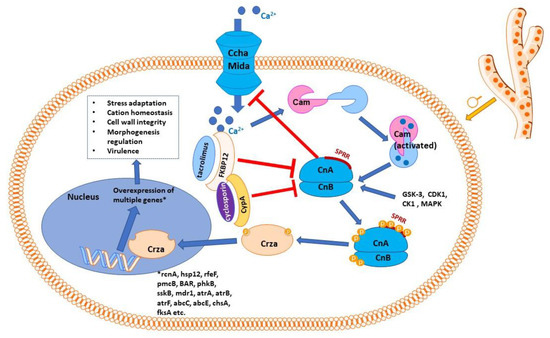 - Manoli, M.; Espeso, E.A. Modulation of Calcineurin Activity in Aspergillus Nidulans: The Roles of High Magnesium Concentrations and of Transcriptional Factor CrzA. Mol. Microbiol. 2019, 111, 1283–1301. [Google Scholar] [CrossRef]