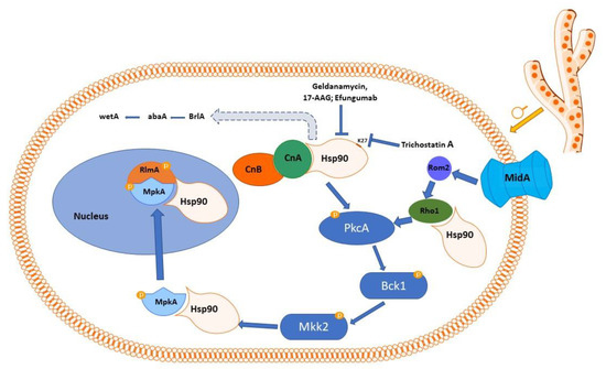 - Rocha, M.C.; Minari, K.; Fabri, J.H.T.M.; Kerkaert, J.D.; Gava, L.M.; da Cunha, A.F.; Cramer, R.A.; Borges, J.C.; Malavazi, I. Aspergillus fumigatus Hsp90 Interacts with the Main Components of the Cell Wall Integrity Pathway and Cooperates in Heat Shock and Cell Wall Stress Adaptation. Cell. Microbiol. 2021, 23, e13273. [Google Scholar] [CrossRef] [PubMed]
