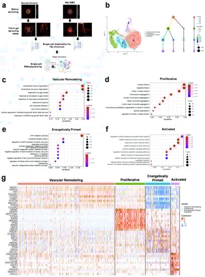 Next, we performed differential expression analysis within each population to compare the transcriptomic profiles of wet AMD and normal sprouting BOECs. We found that across all populations, wet AMD BOECs consistently featured endothelial cell migration and regulation of angiogenesis, while normal BOECs demonstrated cell-substrate adhesion (Figure 2a–d). In the primary populations, extracellular matrix organization and/or degradation were upregulated pathways in wet AMD BOECs (Figure 2a,b), suggesting that matrix degradation mediated their enhanced migration and angiogenesis. Since early stages of angiogenesis require the degradation of extracellular matrix for migration and proliferation of vascular sprouts [], wet AMD BOECs could adopt a more angiogenic and migrative phenotype than normal control cells. Normal BOECs, on the other hand, reflected cell-substrate adhesion as a consistent feature across the proliferative, energetically primed and activated populations (Figure 2b–d). The process of cell substrate adhesion seemed to be mediated by ‘integrin signaling pathways’ that included genes such as ITGA3, ITGA4, ITGAV and ITGB5 (Figure 2c). Specific integrins are known to be upregulated in endothelial cells during VEGF/TGFβ-mediated angiogenesis [,]. Both αvβ3 and αvβ5 are among the key mediators of physiological angiogenesis. Ablation of β3 and β5 integrins actually resulted in increased pathological angiogenesis and tumor growth [], indicating that normal BOECs possessed integrins that were unlikely the drivers of neovascularization under pathological states.