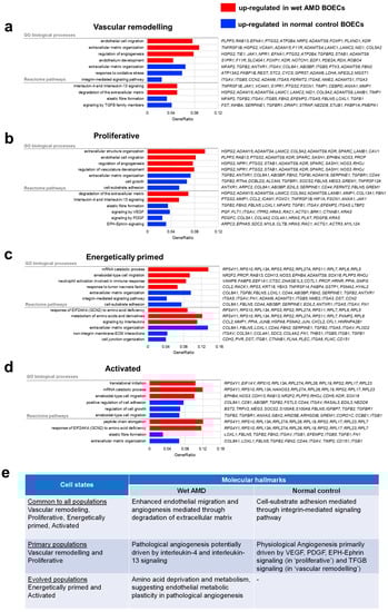 Wet AMD endothelial cells reveal pathological angiogenesis hallmarks. (a–d) Enrichment of top 100 differentially expressed genes (p. adj < 0.05) based on gene ontology biological processes and Reactome Pathway knowledgebases, for each of the four clusters as indicated. The top enriched processes and pathways are shown. Red bars represent wet AMD BOEC-upregulated processes, while blue bars represent normal BOEC-upregulated processes. (e) Summary of molecular hallmarks comparing wet AMD and normal BOECs that are common to all populations and found in primary/evolved populations.