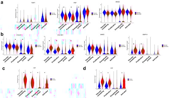 Benchmarking of human sprouting BOECs to in vivo choroidal neovascularization profiles. (a) Violin plots showing expressions of curated CNV tip endothelial cell markers based on Rohlenova et al. (b) Violin plots showing expressions of collagen genes and matrix metalloproteinases. (c) Violin plot showing expression of VWF, an injury marker, in normal and wet AMD sprouting BOECs. (d) Violin plot showing expression of KDR, a VEGF receptor, in normal and wet AMD sprouting BOECs. Asterisks mark significant differential expression between wet AMD and normal BOECs within each cluster, as determined using FindMarkers.