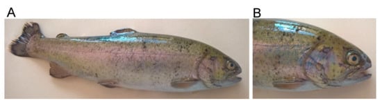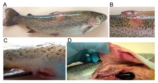 A rainbow trout (Oncorhynchus mykiss) naturally infected with A. sobria. (A) Symptoms of health disorders were manifested as skin infection with visible dermal lesions on the body and erosions on the tail and dorsal fins. (B) Dermal lesions were especially found on the trout’s mouth, around the eyes, and along the operculum—the cover of the gills.