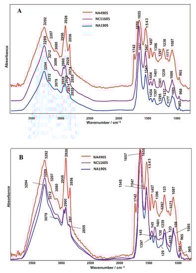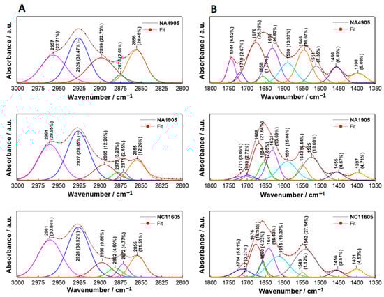 Deconvolution of the lipid (3000–2800 cm−1, (A)) and protein/lipid (1800–1350 cm−1, (B)) regions of NA4905, NA1905, and NC11605 samples into separate subcomponents involving Lorentz/Gauss combination peak fitting function. Each band was allocated a maximum and its percentage contribution to the total surface area.