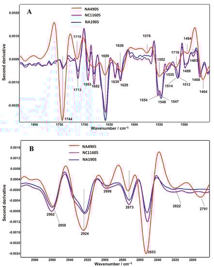 Savitzky–Golay’s second derivative FT-IR spectra in the range from 1800–1450 cm−1 (A) and 3200–2800 cm−1 (B).