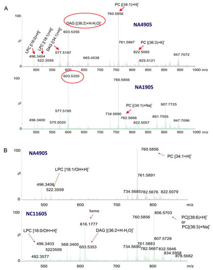 The MALDI mass spectra: (A) the average spectrum of ROI at m/z 603.5 in the kidney tissue slices of apparently healthy fish (control sample NA4905) and fish with mild infection (dermal lesions) (sample NA1905), (B) the average spectrum of ROI at m/z 806.5 in the tissue slices of healthy fish (control sample NA4905) and fish with systemic infection (septicemia) (sample NC11605). The red circle in the (A) represents the DAG (36:2) peak.