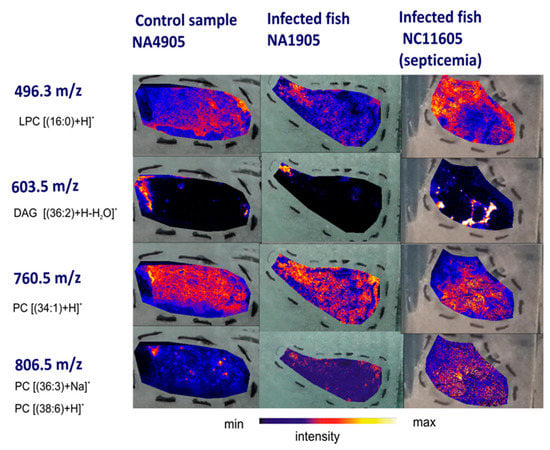 The positive ion mode MALDI-MSI spectrum shown in Figure 6 demonstrates that PC lipids were detected as the predominant ion species, while the peaks corresponding to LPC and glyceryl lipids revealed a lower intensity. No ions assigned to sterols were detected. The ion images of DAG (36:2) at m/z 603.53 revealed that phosphocholine and glyceryl lipids ions are dominated. However, these ions appeared to have a different, opposite distribution in tissue slices of healthy and diseased fish (Figure 6).