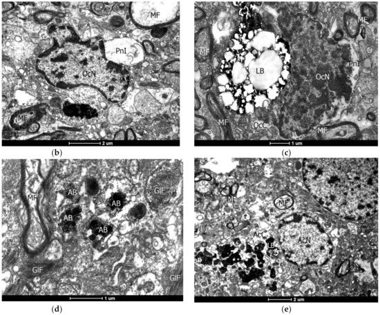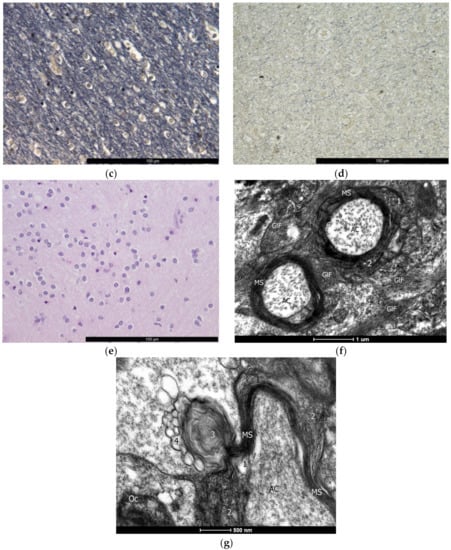 We have also observed the stages of cell disintegration into apoptotic bodies as a result of disruption of the cell membrane integrity. Astrocytes often act as macrophages capable of phagocytosis of apoptotic bodies (Figure 3d,e). In addition, TEM has revealed a wide variety of pathological signs of destruction in the structure of the myelin sheath of axons (Figure 1f,g).