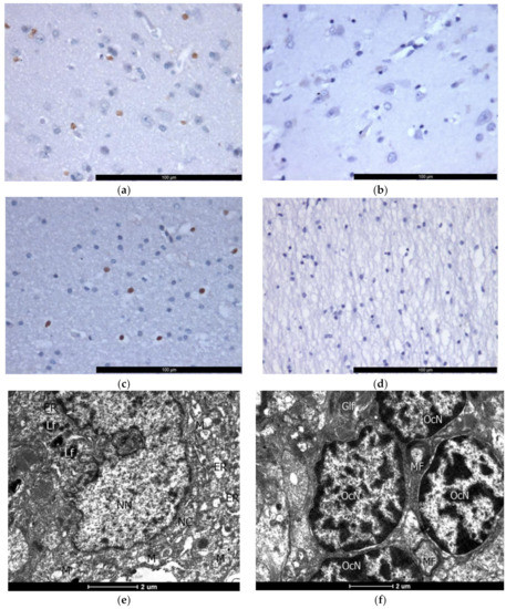 Study of cell apoptosis in the epileptic focus of the temporal lobe. Light microscopy, IHC study of cell apoptosis in the epileptic focus of the temporal lobe: (a) the presence of active caspase-3 in glial cells in the cortex of patients with DRE (brown staining in the cell nucleus); (b) absence of the active caspase-3 in the cortex cells of patients in the comparison group (without epilepsy); (c) the presence of active caspase-3 in glial cells in the white matter of patients with DRE (brown staining in the cell nucleus); (d) absence of the active caspase-3 in the white matter cells of patients in the comparison group (without epilepsy), 400×. TEM, the initial stage of apoptosis: (e) cortical neuron with an elongated, curved nucleus (NN, neuron nucleus), finely condensed chromatin fragments in the karyoplasm, destructively altered mitochondria (M) in the cytoplasm (NC, neuron cytoplasm), dilated tubules of the endoplasmic reticulum (ER) and lipofuscin granules (LF); bar, 2 μm; (f) an accumulation of oligodendrocytes in the white matter of the brain, the heterochromatin of which is distributed throughout the nucleus (OcN, oligodendrocyte nucleus) in large conglomerates. GlF, glyofibrils; MF, myelin fibers; bar, 2 μm; 8200×.