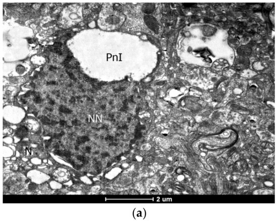The IHC study has shown that predominantly glia, not neurons, undergo apoptosis. TEM has revealed that in the cortex of DRE patients, a significant number of neurons have shown morphological signs of apoptosis (Figure 2e, Figure 3a). We have observed different apoptotic stage neurons and glial cells; early signs of DNA fragmentation based on the presence of heterochromatin clumps spread throughout the karyoplasm (Figure 2e,f). At the later apoptosis stages, we have observed nuclear disintegration against the background of irreversible degenerative changes in the cytoplasm, pronounced perinuclear pockets, sharply dilated tubules of the endoplasmic reticulum and cisterns of Golgi apparatus, which often combined into huge vacuoles (Figure 3).