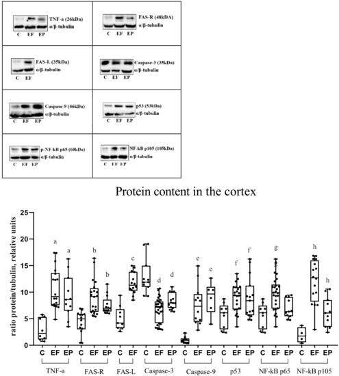 Content of TNF-α, FAS-R, FAS-L, caspase-3, caspase-9, p53, p-NF-kB p65, p-NF-kB p105 in the temporal lobe cortex. Lysates of biopsies of the human temporal lobe cortex were studied on a 10% polyacrylamide gel using Western blot. C, control group; EF, epileptic focus; EP, perifocal zone. Significant differences: a, differences in the content of TNF-α protein in the cortex compared to the control group, statistically significant at p < 0.05; b, differences in the content of FAS-R protein in the cortex in comparison with the control group, statistically significant at p < 0.05; c, differences in the content of FAS-L protein in the cortex compared to the control group, statistically significant at p < 0.05; d, differences in the content of caspase-3 protein in the cortex compared with the control group, statistically significant at p < 0.05; e, differences in the content of caspase-9 protein in the cortex compared to the control group, statistically significant at p < 0.05; f, differences in the content of p53 protein in the cortex in comparison with the control group, statistically significant at p < 0.05; g, differences in the content of p-NF-kB p65 protein in the cortex compared to the control group, statistically significant at p < 0.05; h, differences in the content of NF-kB p105 protein in the cortex compared to the control group, statistically significant at p < 0.05.